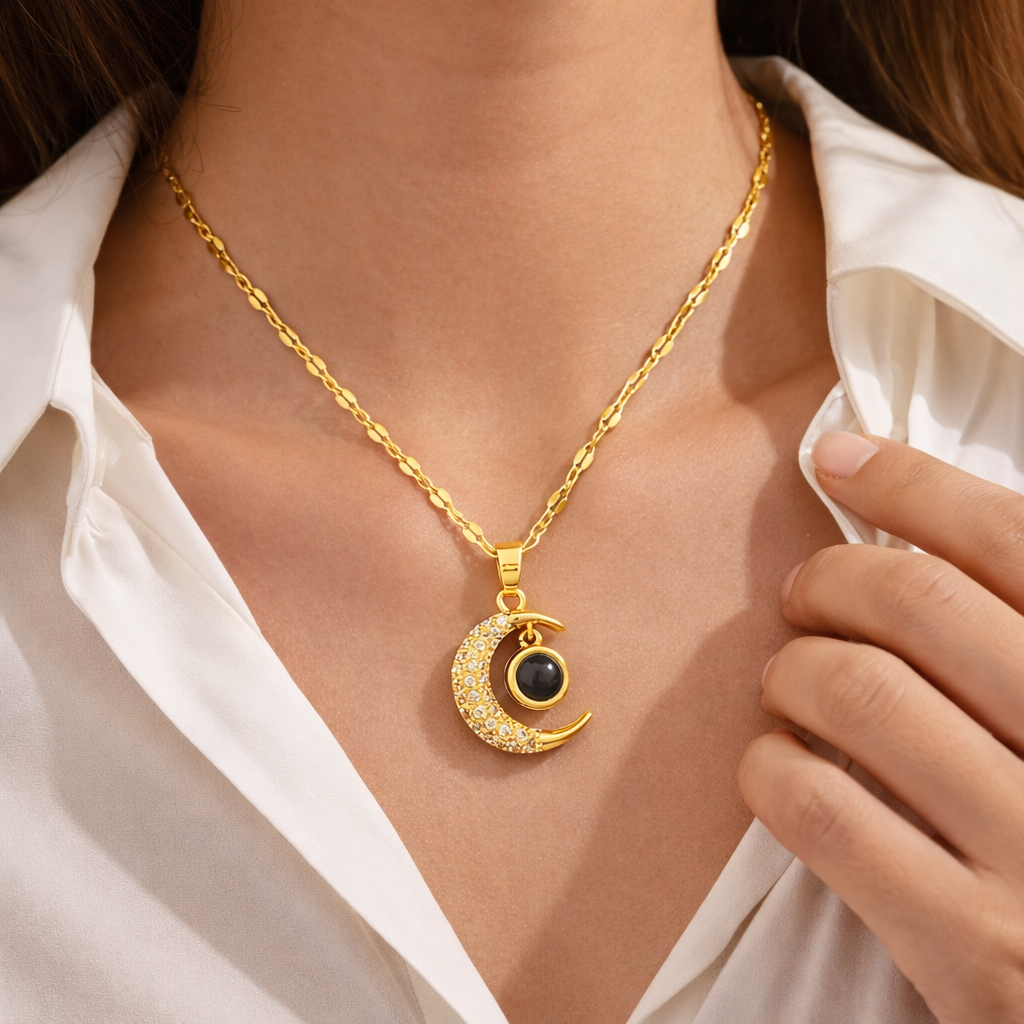 Este delicado collar con diseño de luna creciente combina brillo y misterio, simbolizando amor, protección y conexión eterna. En su interior, una tecnología especial proyecta “Te amo” en 100 idiomas diferentes, creando un momento mágico e inolvidable.